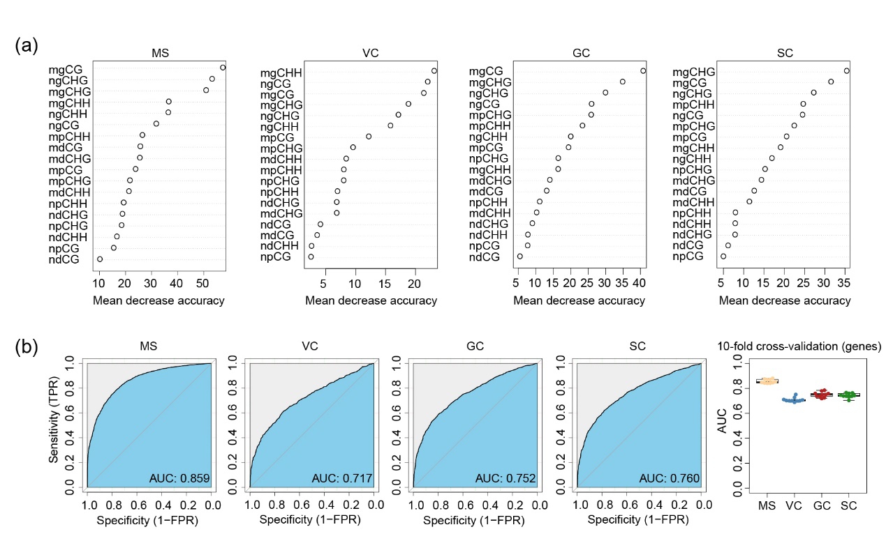 (a) 不同的甲基化特征在随机森林算法预测各细胞类型中基因表达时的重要程度。启动子的甲基化水平(mp), 基因体的甲基化水平(mg), 基因下游的甲基化水平(md), 启动子的甲基化位点数量 (np), 基因体的甲基化位点数量(ng),基因下游的甲基化位点数量(nd)。(b) 反映模型准确性的工作特性曲线下面积(AUC)。真阳性率(TPR),假阳性率(FPR)。