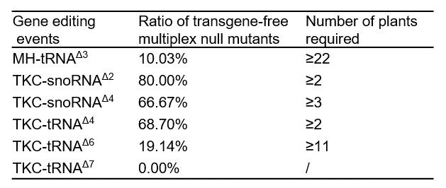 表1:T1代无转基因残留的多基因纯合或双等位突变体比例