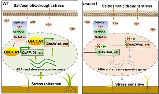 在野生型中,OsCCA1会直接结合在OsPP108启动子上转录激活其表达,进而将ABA信号向下游传递。此外,OsCCA1也能直接调控下游的bZIP转录因子如OsbZIP46的表达,进而激活多个胁迫应答基因的转录,调节水稻对非生物胁迫环境适应性。而在oscca1突变体中,OsPP2Cs多个成员如OsPP108以及下游信号组分如OsbZIP46等胁迫应答因子的转录不能有效的被激活,进而使ABA信号传递受阻,使得植物不能对外界刺激作出相应的反应,多重作用导致突变植株对高盐、干旱以及渗透胁迫更加敏感。