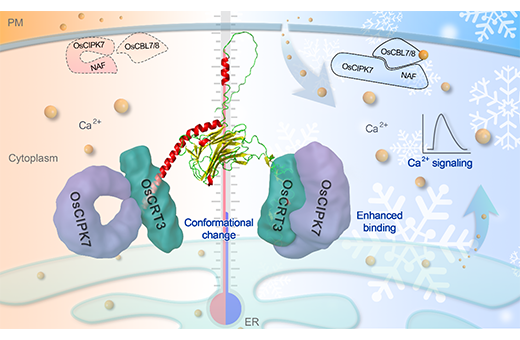 傅里叶红外变换(FTIR)实验结果显示,低温下OsCRT3的二级结构发生改变,β折叠增多,同时伴随着部分亲水性α螺旋结构拉伸变为疏水性α螺旋。表面等离子共振(SPR)实验数据显示低温下OsCRT3和OsCIPK7两种蛋白的特异互作增强,表现为在低温下更快的结合速率(Ka)和更慢的解离速率(Kd),结合常数KD(Kd/Ka)减小(图2),进而增强OsCIPK7的激酶活性。而常温下OsCIPK7的NAF/FISL结构域与激酶结构域结合,抑制其酶活。同时,在低温下内质网定位的OsCRT3调控细胞质钙离子浓度上升,细胞膜上的Ca2+受体OsCBL7/8感知钙离子信号,特异地在细胞膜上与OsCIPK7互作,激活下游的信号转导途径,从而赋予水稻寒害耐受性(图3)。综上,该报道首次发现了温度感知的新机制,即通过蛋白的构象改变感知温度信号,并产生下游的效应,具有重要的理论意义,同时也为分子设计育种提供了新的基因模块资源。