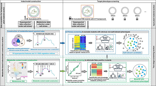 近日,中国科学院植物研究所种康研究组推出基于“高光谱-代谢”双组学耐盐表型高通量精确鉴定技术体系,有效地解决了多组学数据整合表征饲草性状的问题。通过建立代谢物特异的光谱指数和基于偏最小二乘回归法的代谢物含量估算模型,从而整合高光谱和代谢组数据,在上层代谢数据指导下实现光谱特征降维解析,利用机器学习实现目标表型的精准鉴定。在苜蓿突变体耐盐表型的鉴定中,此技术在PCA辅助分析下准确率可达100%,并能够在盐胁迫早期阶段实现表型识别,展示出较强预判能力。双组学表型鉴定采取目标数据特定型模型,无需大量数据即可高效整合表型组与代谢组数据,实现目标表型的精准鉴定。该技术应用于饲草育种,将成为新品种创制强有力的工具和技术体系。