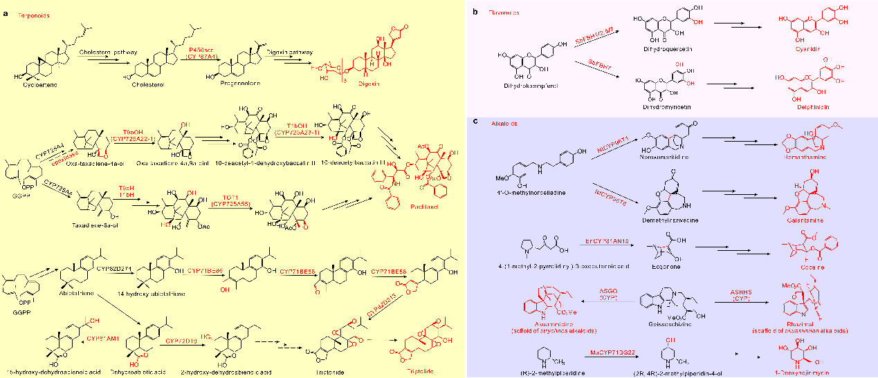 CYPs在三类重要天然产物(萜类、黄酮和生物碱)生物合成中的最新研究进展