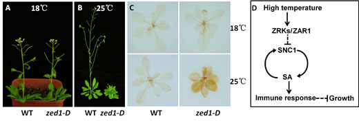 Researchers from the Institute of Botany, Chinese Academy of Sciences (IBCAS) have recently found that a dominant negative mutant of ZED1 (HopZ-ETI-Deficient 1), zed1-D, showed a high temperature-dependent growth retardation and autoimmunity activation. Such growth defects and autoimmunity in zed1-D are dependent on ZAR1 (HopZ-Activated Resistance 1), a direct interactor of ZED1. Further analysis revealed that ZED1 and several ZRK (ZED1-related Kinase) family members are induced by elevated temperature and function cooperatively to suppress the immune response by modulating the transcription of SNC1 (Suppressor of NPR1-1 Constitutive 1) in the absence of pathogens. zed1-D is the first identified high temperature-sensitive autoimmune mutant so far. Based on this mutant, a series of data reveal a previously unidentified role of ZRKs in the ambient temperature-sensitive immune response in the absence of pathogens, and thus advance our understanding of how plants optimize their growth and development in response to the ever changing environments.