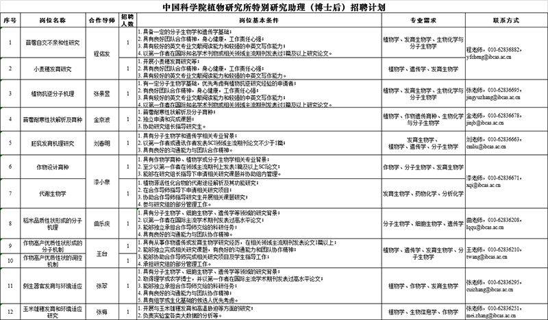详见《中国科学院植物研究所特别研究助理(博士后)招聘计划》(见下表或附件1)。