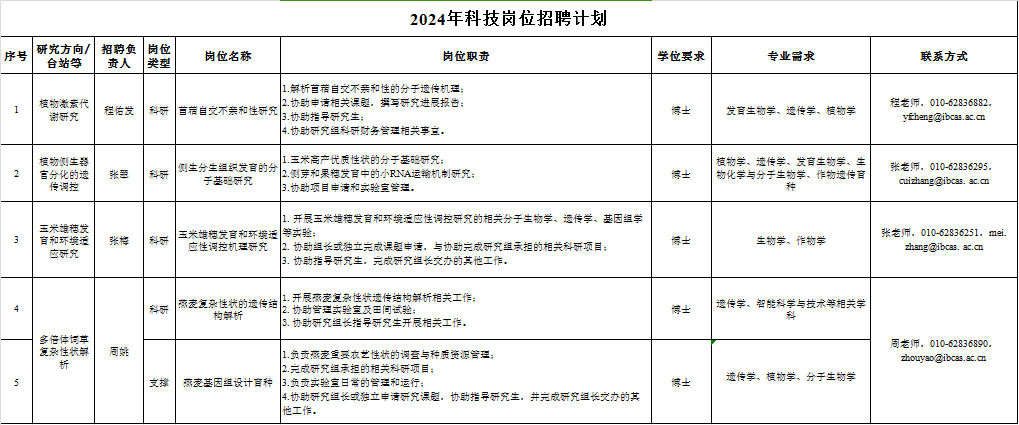 详见《中国科学院植物研究所科技岗位招聘计划》(见下表或附件1)