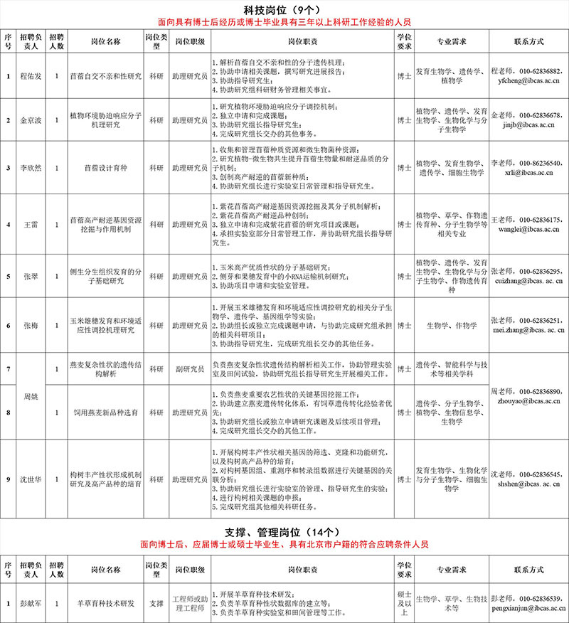详见《中国科学院植物研究所科研和支撑岗位招聘计划》(见下表或附件1)
