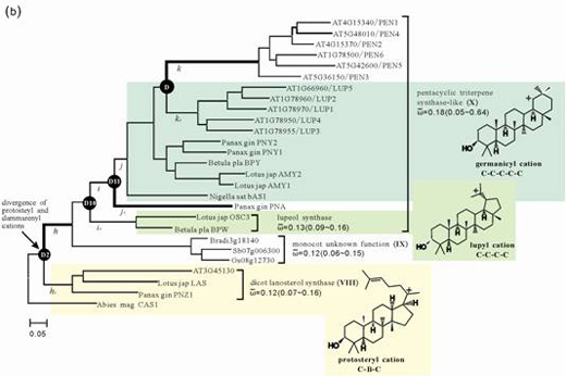 环阿屯醇合酶世系(a)和羊毛甾醇合酶世系(b)的OSC基因序列进化分析图。粗线表示受到正选择作用的分支,右边显示的是一些重要的三萜骨架构象。