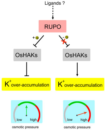 在植物有性生殖过程中,授粉到雌蕊柱头上的花粉细胞萌发产生极性生长的花粉管,花粉管能够快速地在雌蕊内生长,最终将精细胞运输送到雌蕊的胚囊启动受精和胚胎发育。这种特性要求花粉管持续地与雌性细胞的交流互作以及对自身细胞壁和质膜张力变化的监控,从而使快速生长的花粉管在释放精细胞之前能维持细胞的完整性,但其分子细胞学机制尚不清楚。王台研究组发现水稻花粉管质膜定位的类受体激酶RUPO是维持花粉管细胞完整性信号通路的重要信号分子。RUPO基因在花粉中特异性表达,其功能缺失导致花粉的钾离子浓度显著升高和花粉管破裂。 研究发现RUPO与高亲和性的钾转运蛋白互作,RUPO磷酸化修饰促进这种互作,而去磷酸化解除了他们的互作。这些结果显示类受体激酶RUPO以磷酸化依赖的方式调控钾转运蛋白,RUPO-钾转运蛋白模块通过影响细胞内的钾稳态调控花粉管的生长和完整性。该研究揭示了一个新的调控植物细胞完整性的信号通路,为深入理解细胞发育及其完整性调控机制提供了新知识,也为植物雄性育性的遗传操作提供了新的基因原件。