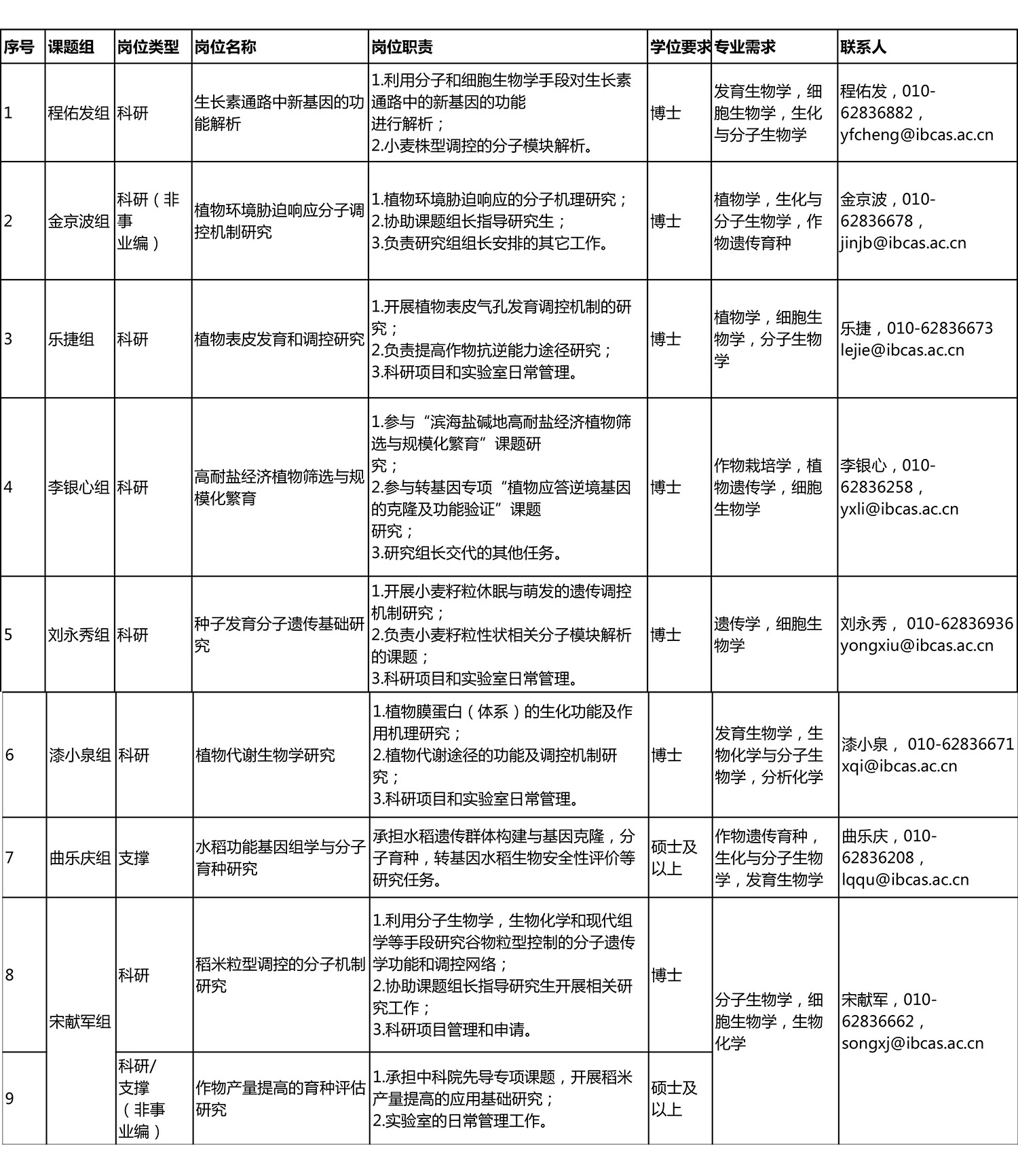 五、应聘程序请应聘者认真填写《中国科学院植物研究所公开招聘人员申请表》(详细说明求学、工作期间的发表论文情况,应聘科研岗位的人员需标出SCI五年影响因子),应聘材料以电子邮件附件的形式发送至招聘岗位联系人邮箱,邮件标题请注明“姓名+应聘岗位+学历+专业+毕业学校+户籍所在地(非应届须注明)”。研究所各岗位招聘部门将根据植物所人员聘用管理办法和岗位基本任职条件,以及具体招聘条件和岗位职责对应聘人员进行资格审查,并电话或Email通知初审合格者后续招聘事宜,资格审查未通过者,不再另行告知。