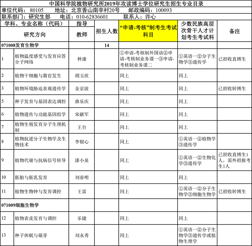 植物分子生理学重点实验室2019年攻读博士学位研究生招生专业目录