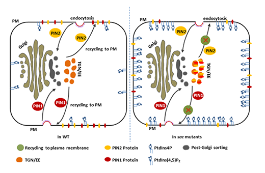 在野生型细胞中(左),PtdIns4P和PtdIns(4,5)P2在质膜上含量很少,PIN蛋白通过内吞作用和蛋白转运维持极性定位;在sac突变体中(右),PtdIns4P和PtdIns(4,5)P2在质膜上大量累积,PIN蛋白从反式高尔基体网络/早期内吞体(TGN/EE)返回质膜的转运过程延迟,极性定位紊乱。