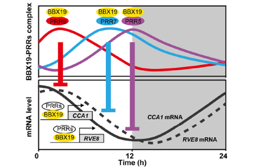 BBX19-PRRs动态互作调控生物钟核心因子CCA1和RVE8表达的模式图