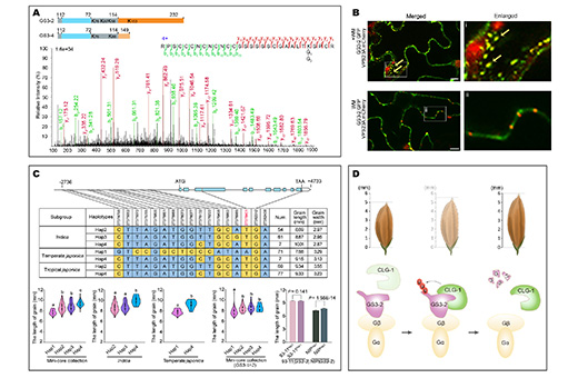 A. 质谱分析显示GS3蛋白多个位点发生泛素化修饰。B. 修饰后的GS3-2被挑选运输至内涵体。C. 优异等位基因分析显示CLG1基因与水稻粒长直接相关。D. 泛素连接酶CLG1直接靶向并泛素化Gγ亚基GS3-2,泛素化修饰的GS3-2被在内膜系统降解,强化G蛋白信号,产生“长粒粳”水稻。
