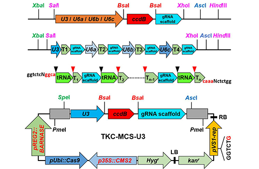为解决上述问题,中国科学院植物研究所刘春明研究组对之前报道的gRNA克隆载体和Transgene Killer Construct (TKC) 编辑载体进行了优化改造,同时结合之前报道的由tRNA间隔实现gRNA串联的方法,巧妙整合之后,建立了一个创制多突变体的简便且省时省力的Customized Assembly and Simplified Editing (CASE) 工具包(图1),极大简化了基因编辑载体构建过程,更主要的是极大方便了后期筛选不携带CRISPR构建的多基因编辑植物。利用CASE编辑系统,对T0代进行基因型鉴定之后,在T1代挑选尽可能多的基因同时突变的多突株系,对于二突到六突编辑,只需要鉴定2到11个T1代单株,就有90%以上的可能性获得无转基因残留的相应多基因纯合或双等位突变体。该技术可被广泛应用于创制多基因突变体,大大节省人力、物力和财力成本。