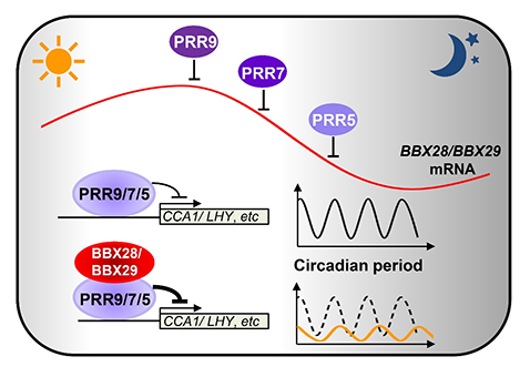 B-Box第五亚家族成员BBX28和BBX29可以在与生物钟核心组分PRR9、PRR7以及PRR5蛋白在细胞核内互作,并增强PRR9、PRR7以及PRR5对表达时相在早晨的基因转录抑制活性。另一方面,BBX28/BBX29两个基因的表达又受到PRR9、PRR7以及PRR5蛋白的转录抑制,从而增强生物钟系统的稳定性。