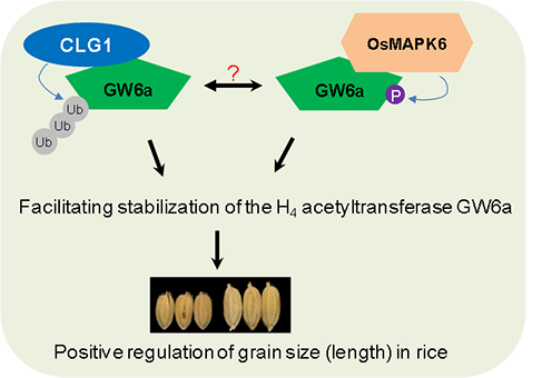 中国科学院植物研究所宋献军研究组利用酵母双杂交文库筛选方法,鉴定到和验证了两个已知的水稻籽粒大小正调控因子OsMAPK6和CLG1。生物化学实验证据表明,OsMAPK6和CLG1能够分别对GW6a蛋白进行磷酸化和泛素化修饰。这些翻译后修饰都增加了GW6a的蛋白稳定性,这与已报道的OsMAPK6和CLG1生化效应截然不同,同时,鉴定到的两个主要GW6a磷酸化位点(丝氨酸142和苏氨酸186)在水稻籽粒大小调控中发挥重要作用。此外,遗传学实验证据表明,分子模块OsMAPK6-GW6a和CLG1-GW6a非加性地正调控水稻籽粒大小(图)。这种非加性的调控方式在对下游基因的表达调控和对GW6a蛋白的稳定调控中得到证实。该研究揭示了多个翻译后修饰协作调控水稻种子大小的新机制,为更加深入地探索作物种子大小的分子调控机理和遗传网络提供了新的视角,也为改良作物相关农艺性状提供了新思路。