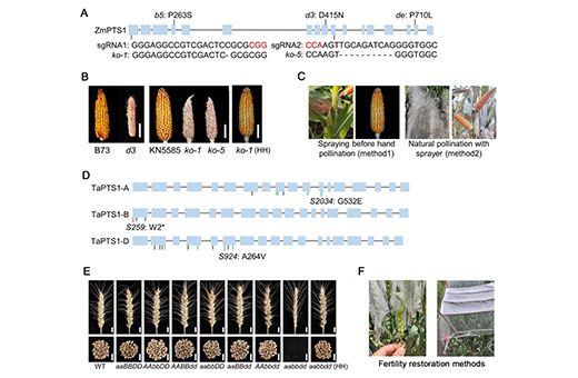 环境敏感型雄性不育系是作物两系杂交育种和制种的基础材料。漆小泉团队前期研究发现水稻三萜合酶基因OsOSC12(OXIDOSQUALENE CYCLASE 12,也称POACEATAPTOL SYNTHASE 1 (OsPTS1))的功能缺失导致花粉包被形成缺陷,其功能缺失突变体在低的相对湿度下表现出雄性不育,而在高的相对湿度下能恢复其育性(Xue et al, 2018 Nat Commun9: 604)。OsPTS1基因在禾本科植物中具有保守性。其中,玉米有一个直系同源基因ZmPTS1,而小麦有三个同源基因,即TaPTS1-A、TaPTS1-B和TaPTS1-D。据此,团队研究人员通过化学诱变和CRISPR/Cas9敲除技术,创制了玉米和小麦PTS1基因的突变材料。