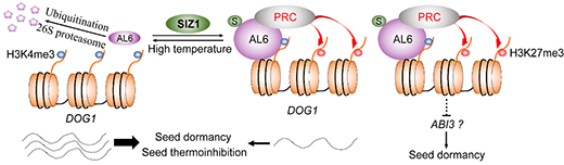 近日,中国科学院植物研究所金京波研究组发现AL6的SUMO化修饰通过调节DOG1转录来调节种子休眠和热抑制。SUMO E3连接酶SIZ1介导的SUMO化修饰抑制AL6蛋白降解,并介导AL6与DOG1位点的结合,从而抑制DOG1转录及种子休眠。此外,高温降低AL6的SUMO化修饰水平,导致AL6蛋白降解,从而上调DOG1转录水平并抑制种子萌发。因此,AL6的可逆SUMO化修饰精确调节DOG1的表达,从而确保种子休眠的精确建立和高温下种子萌发的抑制(图)。
