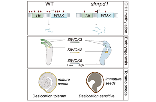 近日,中国科学院植物研究所王台研究组解析了RdDM对番茄胚胎发育和种子脱水耐性的影响。研究发现SlNRPD1的失活导致CHH甲基化水平和24-nt siRNA的显著降低,同时伴随着内切核糖核酸酶SlDCL2b/c/d的特异性激活与21-22 nt siRNA的积累。在番茄中,转座元件(TEs)和非TE重复序列通常位于SlWOXs和SlPINs基因体内或附近,而AtWOXs和AtPINs基因座上的转座子和重复序列相对较少。NRPD1的缺失引起的重复序列CHH低甲基化可能通过改变WOX/auxin信号通路的基因表达,进而导致胚胎发育缺陷和种子不育。该研究为理解DNA甲基化在植物生殖发育中的调控机制提供了新的视角。未来有望改良作物的种子发育和耐脱水性,为作物育种提供新的策略。