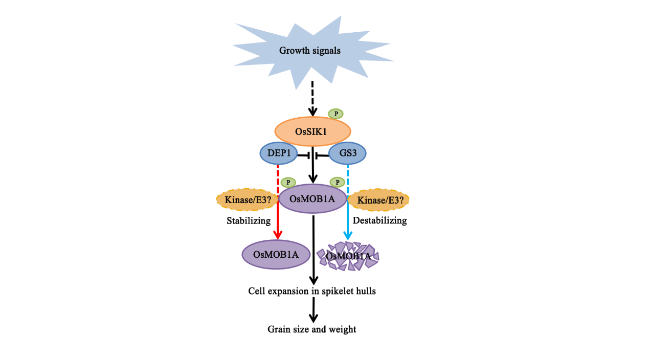 程佑发研究团队近年来对植物Hippo信号通路开展研究,在拟南芥中发现Hippo信号通路参与调控生长素和茉莉酸介导的植物生长发育(Cui et al., 2016, PLoS Genetics; Guo et al., 2020, Plant Physiology)。通过进一步对Hippo信号通路中的关键组分蛋白激酶OsSIK1和支架蛋白OsMOB1A在水稻中的作用及机制的研究发现,过表达OsSIK1或OsMOB1A都导致水稻籽粒变大,而基因敲除都会造成籽粒变小,说明OsSIK1和OsMOB1A是水稻籽粒大小的正调控因子。生化实验发现OsSIK1与OsMOB1A互作,而OsSIK1通过磷酸化OsMOB1A调节其稳定性。研究还发现调控水稻籽粒大小的关键因子G蛋白γ亚基DEP1和GS3能够与OsSIK1互作,从而影响OsSIK1与OsMOB1A的相互作用以及OsSIK1对OsMOB1A的磷酸化;而且G蛋白在体内调节OsMOB1A的稳定性。遗传分析表明,G蛋白位于Hippo信号通路的上游,在同一遗传通路中发挥调控籽粒大小的作用。该研究结果揭示了G蛋白通过调控Hippo信号通路控制水稻籽粒大小的分子机制,为提高产量提供了潜在的靶基因。