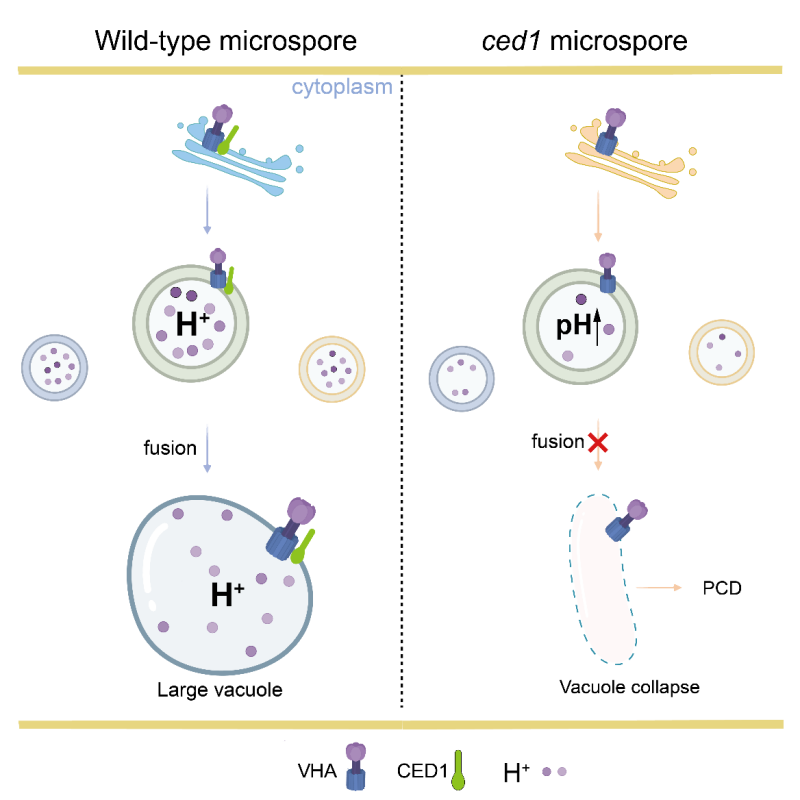 近日,王台研究团队以番茄为材料研究发现,CED1特异性地在减数分裂阶段的花粉母细胞和四分体中表达,其蛋白定位于质膜-内膜系统。CED1功能缺失导致完全雄性不育,该不育表型并非源自绒毡层异常,而是起因于小孢子发育异常。突变体小孢子无法形成中央大液泡,液泡质子稳态异常,激活液泡介导的PCD进程,染色质异常凝聚和片段化。进一步研究发现,CED1与液泡H⁺-ATP酶(VHA)c亚基互作,维持液泡质子稳态与酸性环境;因此,CED1功能缺失导致液泡pH值上升,最终触发液泡崩解和PCD。该研究不仅揭示CED1-VHA-c模块作为"液泡酸化监控-PCD执行"的分子开关控制小孢子命运,更为番茄等作物杂种优势利用提供了关键基因模块。