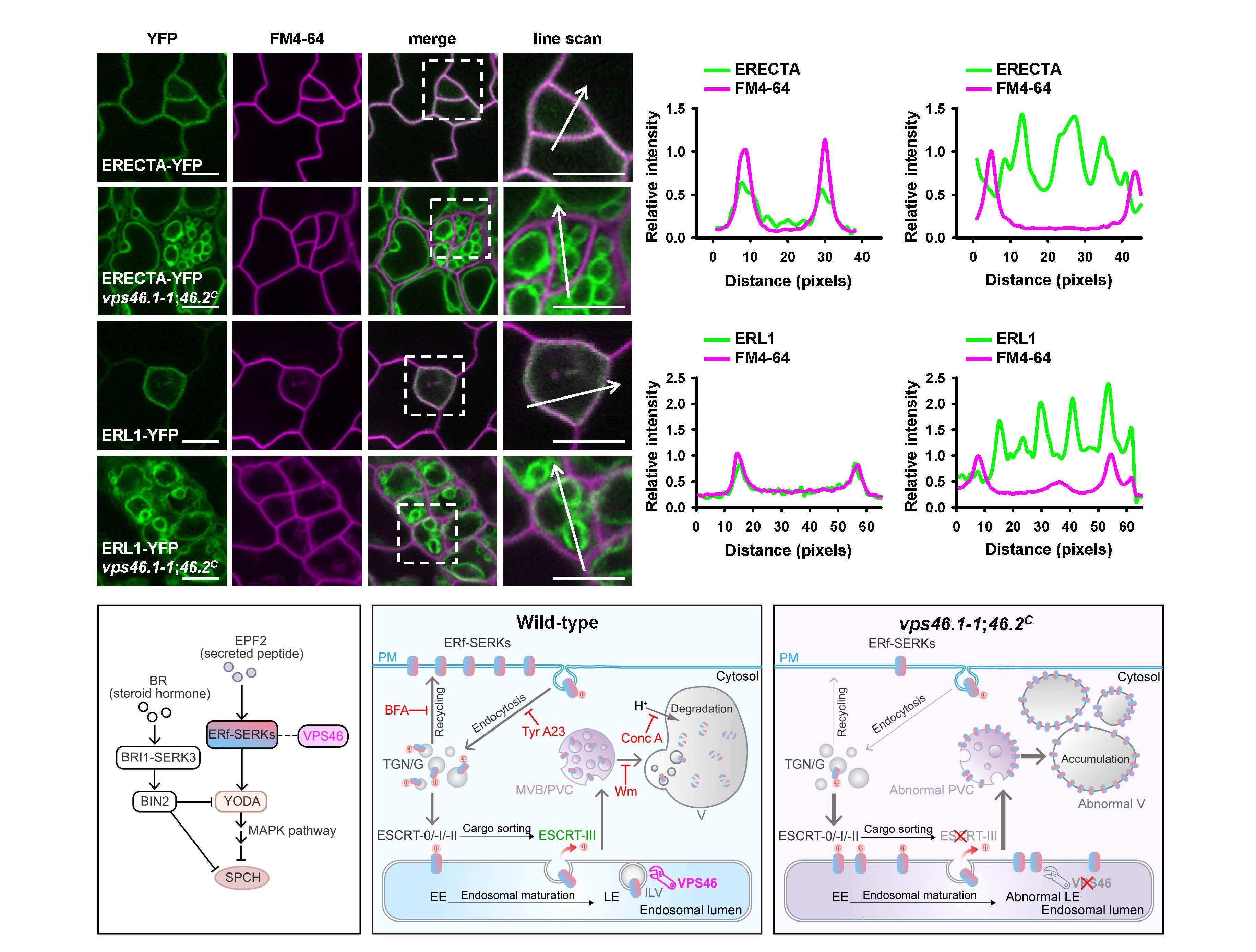 研究人员通过遗传学分析,将VPS46的功能定位在气孔发育信号通路中EPF2配体下游、YODA-MAPK级联上游的关键节点。细胞生物学证据表明,VPS46定位于晚期内体,并与ERf-SERKs受体共定位。在vps46.1-1;46.2C双突变体中,ERf-SERKs复合体虽能被内吞并分选至LE/MVB,但其向液泡腔的释放被阻断,导致该复合体异常累积在液泡膜上而无法降解。这一运输阻滞导致功能性ERf-SERKs复合体在质膜上的水平下降,进而减弱了其抑制气孔世系细胞过度分裂与分化的信号输出,vps46.1-1;46.2C双突变体气孔前体细胞分裂失控、分化受阻,气孔空间分布模式被破坏,最终表现出气孔前体细胞簇和气孔簇的异常气孔表型。关键的是,在vps46.1-1;46.2C双突变体中,BRI1的内吞循环、黑暗诱导的液泡降解以及其介导的油菜素内酯eBL信号响应均维持正常。这直接证明VPS46参与的内体分选过程具有底物特异性,而非普遍作用于所有经MVB途径的膜蛋白。
