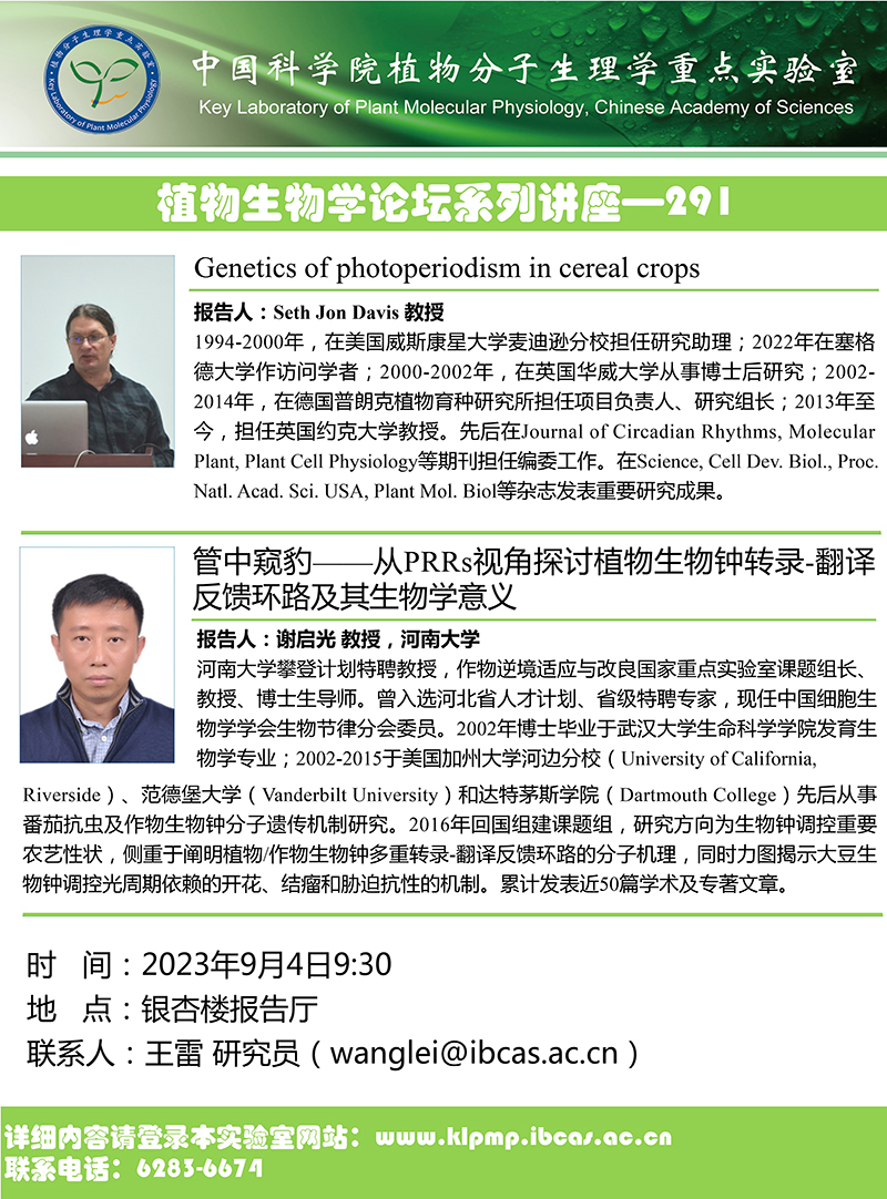 “植物生物学论坛”系列讲座—291:"Genetics of photoperiodism in cereal crops"和"管中窥豹——从PRRs视角探讨植物生物钟转录-翻译反馈环路及其生物学意义"